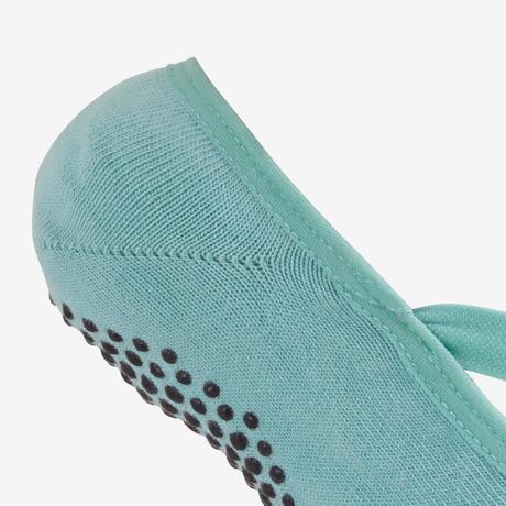 En strumpa som enkelt dras på foten, och som hålls på plats av resårband. Silikonnopporna under foten ger dig bättre grepp när du tränar pilates och soft gym.