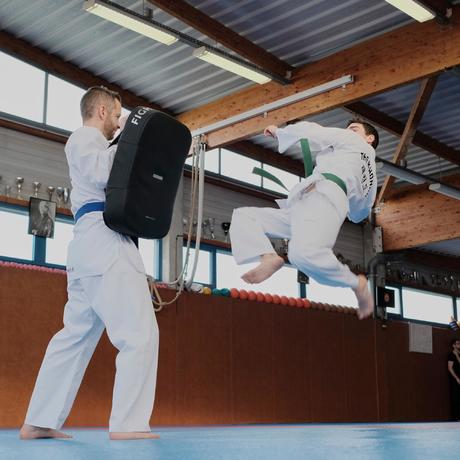 Taekwondo är en kampsport med tacklingar som baseras på knytnävsslag och sparkar. Så det är klart att man svettas, och kanske inte så lite!