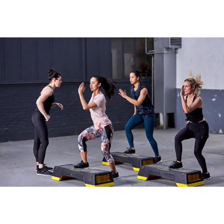 Vid fitnessträning är det framfoten som slår emot golvet först, och inte som vid löpning hälen.