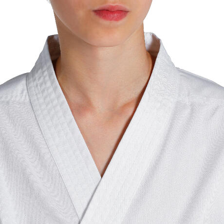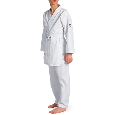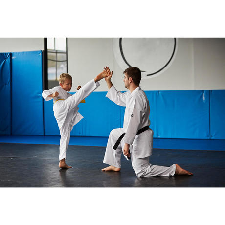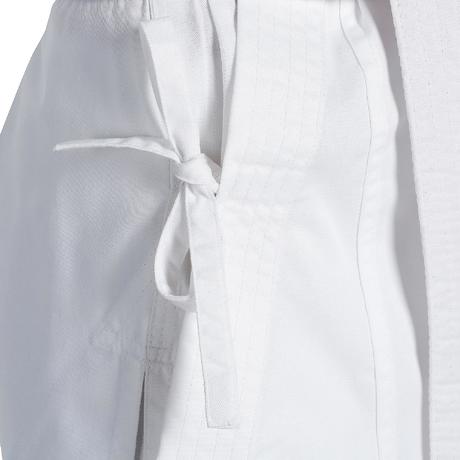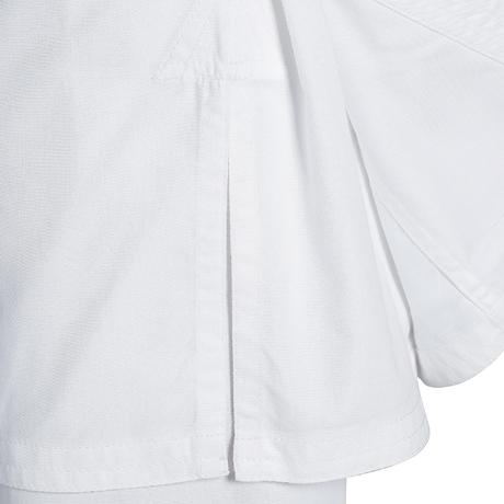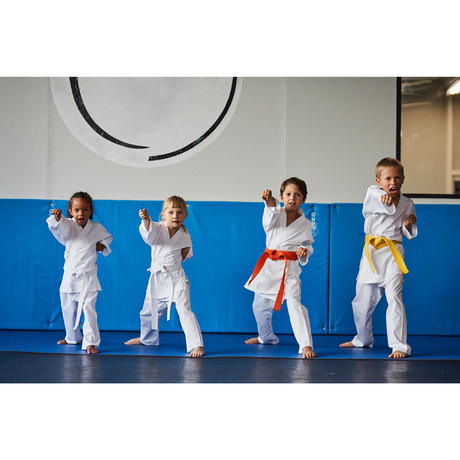 Dräktens mjukhet och hållbarhet underlättar när den unga karatekan lär sig baserna i denna sport. Förstärkt i partier utsatta för slitningar. Ett vitt bälte ingår.