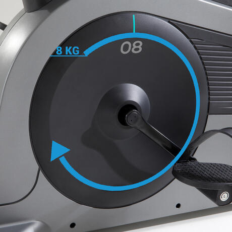 Ju mer vikt på hjulet, desto mer följsamhet på tramporna, vilket ger skön träning.Motionscykeln E ENERGY är en förstklassig produkt från Domyos, med ett snurrhjul på 8 kg.