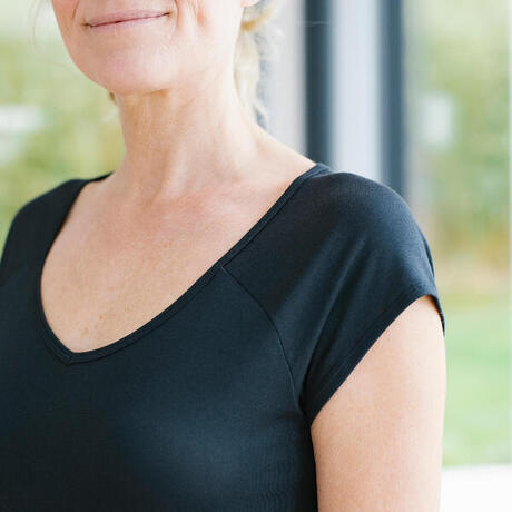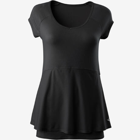 T-shirten kommer inte att rulla upp under träningen. Den tighta delen kommer inte att röra sig och den lite större delen täcker höfter, mage och lår.