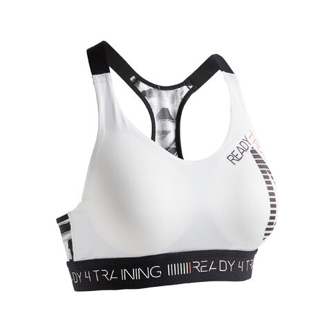 Sportbehån 500 med bra stöd* passar för sportaktiviteter med medelstor påverkan som t.ex fitnessdans, konditionsträning och cross training.